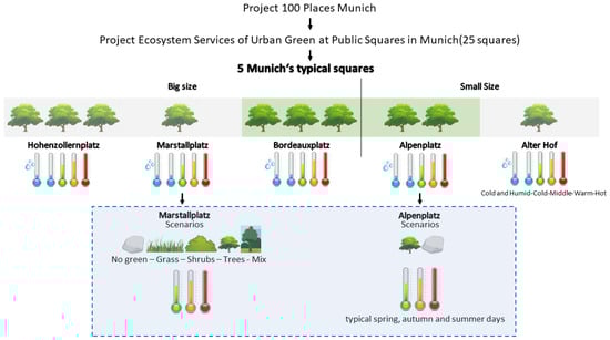To develop practical recommendations for cities and communities in Bavaria, the Center for Urban Ecology and Climate Adaptation of the Technical University of Munich (ZSK) was established in June 2013. Among the interdisciplinary research coordinated by the ZSK, the subproject 100 Places:M investigated the effects of climate change and heat island effects, as well as the design, use, and occupancy of public places in 100 open areas of Munich []. To refine the results from the 100 Places:M project and gain further insight into the potential of climate-adapted design to enhance the functionality of public spaces, the follow-up project “Ecosystem Services of Urban Green at Public Squares in Munich” [] was developed.