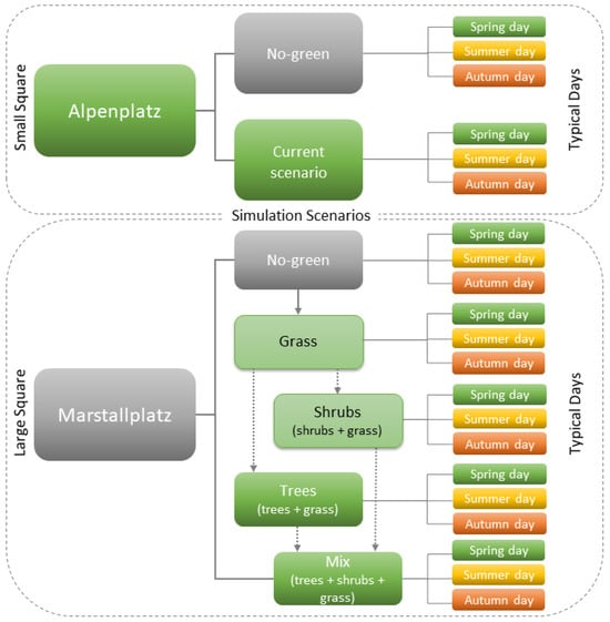 Five distinct scenarios were developed, combining grass, shrubs, and trees, for analysis across three typical days. Data from DWD station 3379 in Munich City (WST) for 2020 were utilized to identify typical days. The focus was on extended periods of weather stability, with a grouping of days exhibiting similar air temperature and humidity curves and regular patterns. Based on the collected data, the three typical days were classified as mild, warm, and hot, representing a typical spring day, a typical autumn day, and a typical summer day. The method employed for the selection of days is fully detailed in the work of Stark da Silva et al. []. Figure 2 illustrates the procedure for selecting the squares. The upper part of the figure shows the five initially selected Munich squares, which differ in size, number of trees, and type of pavement. The current thermal comfort performance of the squares was previously analyzed on five typical days: cold, cold and humid, medium, warm, and hot. The lower part of the figure refers to the part of the work discussed in this paper. This study, in turn, analyzes how different strategies of planting greenery affect human thermal comfort. This study focuses on a typical spring day, a typical autumn day, and a typical summer day. The winter season and rainy days were not considered because the intensity of use of the squares in these conditions is low.
