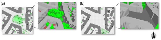 Alpenplatz current scenario (a) and no-green scenario (b).