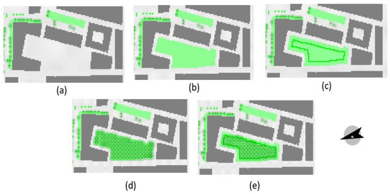 Marstallplatz simulation scenarios: no-green (a), grass (b), shrubs (c), trees (d), mix (grass, shrubs, and trees) (e).