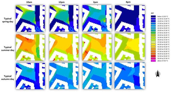 Alpenplatz’s no-green scenario PET variation during the typical days: spring, autumn, and summer.