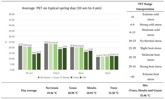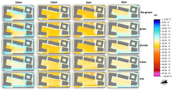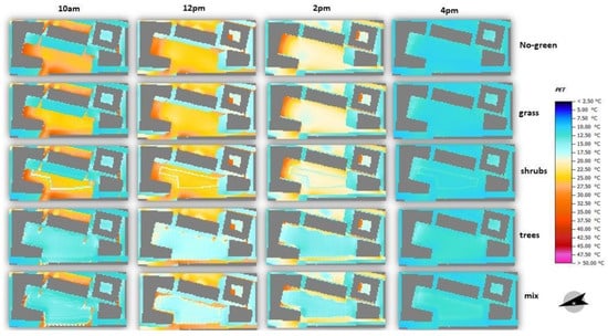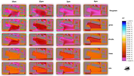 The study examines the average PET between 10 a.m. and 4 p.m. It employs an extreme situation of no greenery as a baseline to understand how each added element affects human thermal comfort in the cases studied. The different elements of green that are considered include grass, shrubs, and trees (Figure 3).