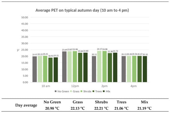 On the typical autumn day, despite the onset of senescence, the trees still have leaves that provide shade that impacts the PET values. However, at 10 a.m. and 4 p.m., the buildings’ shade is the factor that affects the PET the most, decreasing the values to 12 °C when compared to the sun-exposed areas, as can be seen in Figure 11. This results in slight cold stress for the PET under the buildings’ shade at 10 a.m. and 4 p.m. in all scenarios. However, the average PET observed is not under any thermal stress.
