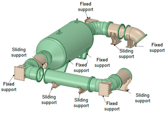 In the solid region, the heat engine load and constraint mode are mainly considered. The default gravity acceleration of the software is adopted in the whole model, and the direction is straight down along the Y-axis. Meanwhile, the catalyst mass is applied to the internal support of the reactor in the form of equal effect. The internal pressure and temperature of the SCR system need to be defined separately. In the thermo-fluid-solid coupling, the above two parameter values are directly transmitted by Fluent. There are two main constraint modes: fixed support and sliding support. Fixed support restricts all degrees of freedom, and sliding support can move freely along the axis. The specific layout is shown in Figure 3.