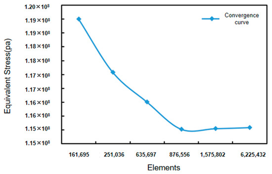As can be observed in Figure 4 the difference between the calculated results of the two adjacent cases is less than 5%, and the results are convergent, with the maximum stress approximately 1.15 × 108 Pa. On this basis, we continue to check the mesh quality and find that the mesh cell quality is approximately 0.8, which meets the calculation requirements. In addition, the above verification should be further repeated if other working conditions are calculated.