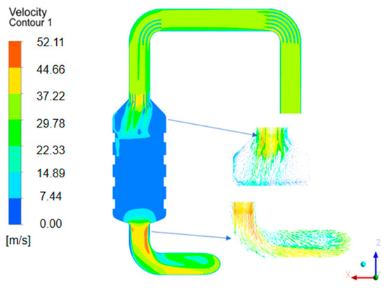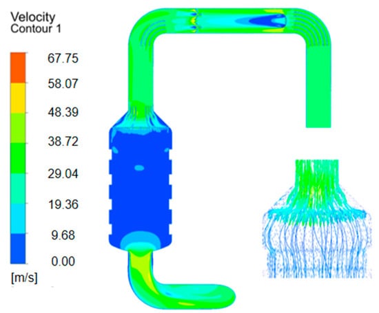 The degree of the selective catalytic reduction reaction of the SCR system is affected by the flow rate of tail gas and mixing uniformity, so the initial scheme is to set a diversion device in the intake bend section. Make Section 1 (XZ section, Y = 0) of the SCR system through the central axis (As shown in Figure 6) and analyze the velocity distribution cloud map of this section (As shown in Figure 7). It can be observed that, compared to the part where the guide plate is added, the velocity uniformity of the exhaust gas at the outlet bend is poor, and the velocity near the bend area and outside the outlet pipe wall is higher. The exhaust gas is affected by the contraction section of the reactor, causing a decrease in pressure and an increase in flow rate, resulting in limited gas directional ability. Afterwards, under the influence of inertial force, it flows forward through the bent pipe section until it collides with the outer pipe wall and changes direction, causing fluid separation and resulting in lower flow velocity below the bent pipe. After mixing with the outside fluid, the flow rate on the lower side of the outlet pipe is higher and then gradually decreases due to the influence of viscosity. After the gas hits the wall and changes direction, it mixes with the outside fluid. The flow velocity of the pipeline and the outside wall of the reactor is faster and enters the outside direction of the reactor. However, due to inertia, the gas did not mix evenly in the flare-up section in time, and the gas flow and velocity on both sides were low, so a vortex was formed on both sides of the conical head of the reactor.