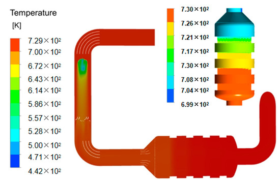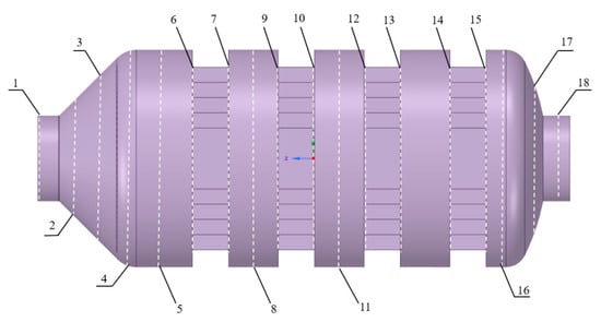 It can be observed from the above that the marine diesel engine HP-SCR is subjected to a large heat engine load in the working project, and the reaction efficiency is related to temperature. Won et al. pointed out in their study that 1224 kJ of heat is released per mole of standard SCR reaction at a temperature of 300~400 °C [22]. As the reaction continues in the SCR system, there is a large temperature difference between the catalyst layers of the reactor, resulting in a large thermal stress effect on the shell [23,24,25].