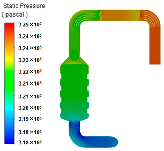 In the actual work project, the exhaust gas flow speed inside the SCR system is not uniform, and the changes in pressure and temperature acting on the flue and reactor are not constant or linear. Therefore, this section first takes the whole system as the research object, uses Fluent to perform flow field analysis and explores the temperature changes caused by urea injection and the SCR reaction and the pressure changes caused by pipe bending and the catalyst layer. Then, the above results are taken as the boundary conditions and coupled with thermodynamic analysis. The effects of different pressure and temperature distributions on the stress and deformation of the SCR reactor were considered.