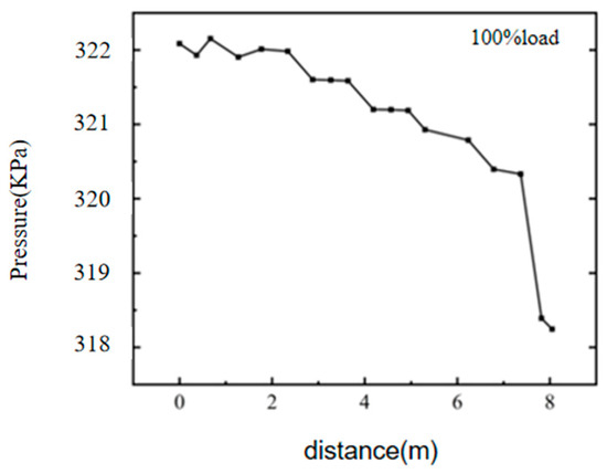 In this section, the unidirectional fluid-structure coupling method is used to simulate the reactor structure strength, considering the influence of flow field pressure and temperature changes. In order to make effective use of computing resources, the urea hydrolysis reaction is omitted in the following simulation calculation. Figure 9 shows the manual selection of 18 cross-sections with different spacing, mainly guided by the location of the catalyst layer. The overall pressure distribution and reactor pressure changes along the path are shown in Figure 10 and Figure 11. When the waste gas flows through the mixer, under the action of the baffle, the cross-sectional area of the flow channel changes, the flow rate increases, and the pressure decreases. Thereafter, the pressure will rise somewhat under the influence of the exhaust disturbance, and the static mixer and other diversion devices together cause an increase in the pressure loss of the SCR system. When the tail gas flows through the catalyst layer, the pressure decreases and changes linearly under the action of catalyst resistance, which follows Darcy’s law. According to Bernoulli’s principle, the flow rate of the engine exhaust increases, the pressure decreases in the retracted section of the reactor, and the change rate is higher than that in the expanded section.
