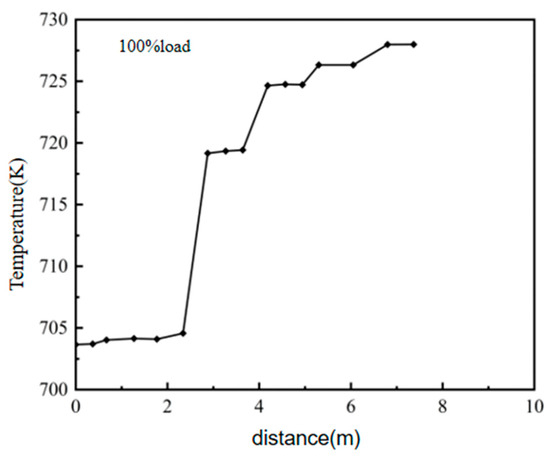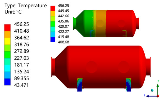 As can be observed in Figure 16, the highest temperature of the reactor barrel is slightly higher than the initial temperature of the waste gas, 456.25 °C. Due to the heat transfer between the reactor and the support in the extension direction, there is convection heat transfer between the reactor and the external environment in the vertical extension direction. Therefore, the farther away from the cylinder, the lower the support temperature and the larger the temperature difference between the reactor and the support plate. From the reactor to the support plate, the temperature is distributed in steps. Due to the heat conduction effect of the backing plate, the temperature of the side away from the backing plate drops faster. The lowest temperature occurs in the area of the supporting plate, which is higher than the external environment temperature, specifically 43.47 °C, which decreases by approximately 90% compared with the area of the supporting plate. The temperature distribution of the cylinder in the axial direction is quite different, the difference between the highest temperature and the lowest temperature is 48 °C, and the distribution trend is not uniform. The main influencing factors are as follows: The flow velocity distribution of the tail gas deviates through the elbow and the reactor guide plate, and the fluid velocity near the outer side of the elbow is higher in the positive direction x, which leads to gasification in the pipeline and chemical reaction in the catalyst layer for heat exchange. Therefore, the temperature in the visible direction of the reactor in the following figure is lower than that on the other side, and the axial temperature distribution conforms to the temperature variation law of the flow field.