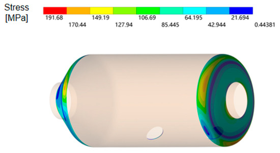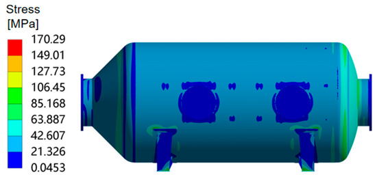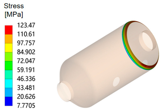 In the simulation calculation process, the thermo-fluid-solid coupling comprehensively considers the influence of fluid temperature, pressure and velocity changes on the structural strength of the reactor. Taking mechanical load as an example, the pressure drop in the catalyst layer of the reactor is large, and the pressure distribution is not uniform. Its fluctuations will cause slight changes in mechanical stress. As can be observed in Figure 14, the maximum stress of the reactor is 175.73 MPa, which appears at the constraint of the supporting base plate and belongs to the sharp corner of the geometric structure. According to the elastic theory, the stress here is infinite and cannot be converged by thinning the mesh, which belongs to the stress singularity. The maximum stress of the main body of the SCR reactor appears at the spherical head, which belongs to the discontinuous part of the structure and is a phenomenon of stress concentration. Figure 15 shows the stress on the inner wall of the spherical head of the reactor, and it can be observed that the maximum stress at this time is 123.47 MPa.