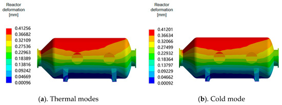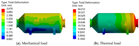 The calculation model used in this section is arranged horizontally, with sliding supports releasing axial degrees of freedom. The specific deformation under mechanical and thermal loads is shown in Figure 18. The maximum deformation of the reactor under thermal load is 40.22 mm, and the maximum deformation under mechanical load is only 2.73 mm, which is much lower than that under thermal load. However, the deformation distribution trend of the two is the same, and the displacement of the outlet area of the reactor is large because the support of the inlet and outlet ends is a sliding support, allowing for the reactor to expand in the axial direction. At the same time, the reactor is thermally expanded under the action of temperature, and its displacement is affected by the distance from its own position to the constraint point and the temperature difference, so the reactor outlet deformation is larger under the action of thermal load.