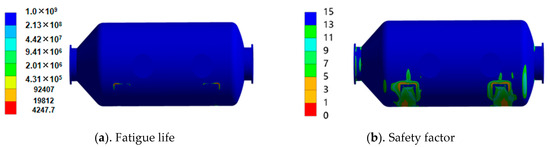 The materials, such as the flue, mixer and reactor barrel, of the SCR system are inconsistent with the support, so the fatigue life prediction does not conduct too much research on the support and mainly shows the life distribution of the flue, mixer, reactor barrel and head area. In addition, the design life of high-cycle fatigue analysis is generally higher than 1e6 times, so this section evaluates the damage coefficient on this basis. Figure 21 shows the prediction of the reactor life under mechanical load conditions. It can be observed in the figure that the minimum life is more than 7 × 106 times. However, due to the limitation of the S-N curve data, the life is uniformly displayed as 1 × 107 times in the area of stress less than 100 MPa. The area with the lowest life is the chamfer where the reactor head is connected to the cylinder, which is consistent with the stress distribution trend. In the process of analysis of the fatigue safety factor, in order to make the distribution of the factor clearer, the design life is set to 1 × 107 times. As can be observed in the figure, the fatigue safety factor is lower at the head and the discontinuity of the structure, and the lowest safety factor is 0.8391, which appears at the rounded corner of the left end cylinder and is also the position where the stress is the greatest. After the addition of a thermal load, the thermal stress is formed due to the temperature gradient and constraint effect, and the stress in some regions of the reactor is higher than the yield strength. A low-cycle thermal fatigue analysis was adopted, and the strain–life curve generated was invoked after six parameters were input; the results are shown in Figure 22. The minimum life is 4247 times, which occurs in the structural discontinuity between the support and the reactor, and the distribution trend of stress and strain is the same. In addition, there are geometric sharp corners in the above areas, and some gaps can be reserved in the welding process, so it is planned to establish a model for the simulation calculation in the above areas in the future. The design life was defined as 3000 times, and the fatigue safety factor was observed. It can be observed in the figure that the fatigue safety factor was lower at the head and the discontinuity of the structure, the lowest being 1.7579, which was the same distribution trend as the fatigue life.