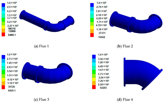 The analysis method of each flue in the SCR system is the same as that of the reactor. As can be observed in Figure 23, the minimum life of each flue is 3465 times, which occurs at the structural discontinuity between the support and the flue, and the distribution trend of stress and strain is the same.