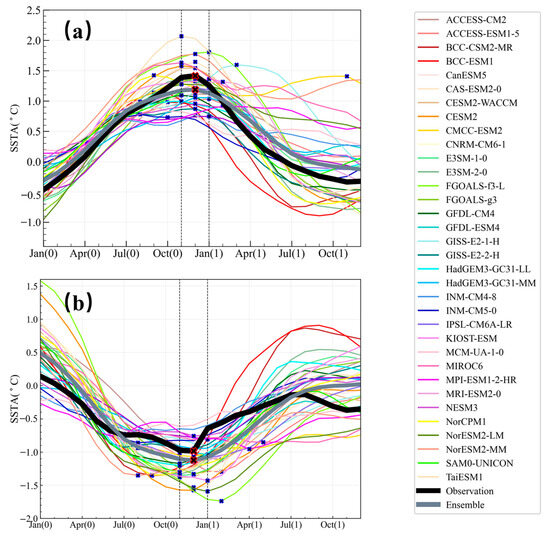 Evolution of the composite distribution of SSTA in the Niño3 region during El Niño (a) and La Niña (b) events in Observations (black line) and 34 CMIP6 models (other colored lines). The gray line is for the model ensemble mean. The crosses in (a,b) represent the peak points of the different curves, which are defined as the peak month of El Niño (a) and La Niña (b) events.