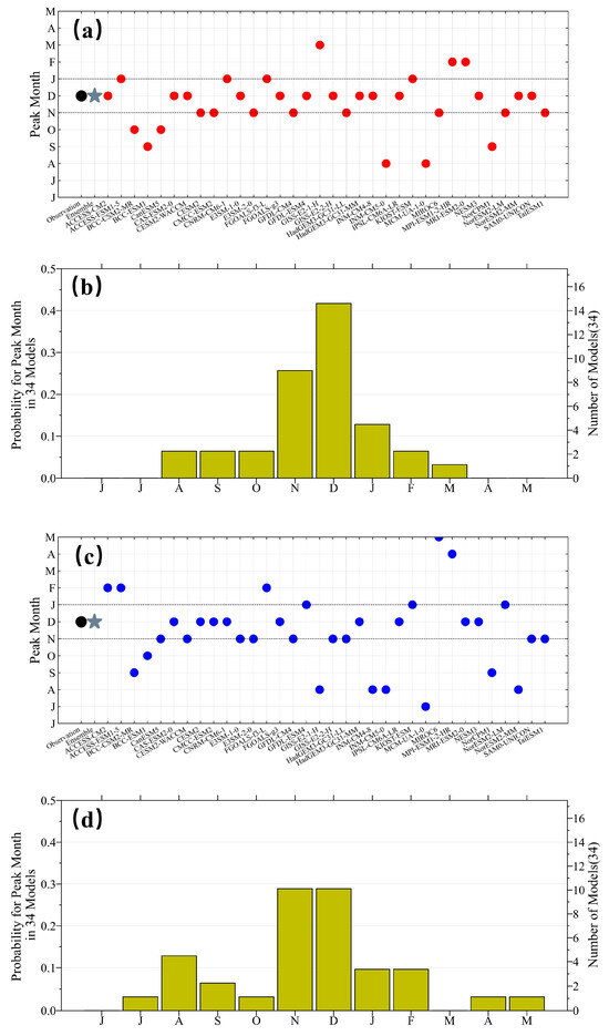 The peak month and probability distribution of the peak month for El Niño (a,b) and La Niña (c,d) events in the observations and CMIP6 models. The peak month is defined as the calendar month at which the Niño3 SSTA has its maximum value during the El Niño (a) and La Niña (c). The black dots in (a,c) represent the peak month in observations, and the gray stars represent the model ensemble mean. The red dots in (a) indicate the peak month of El Niño events for individual model members in CMIP6. The blue dots in (c) indicate the peak month of La Niña events for individual model members in CMIP6.