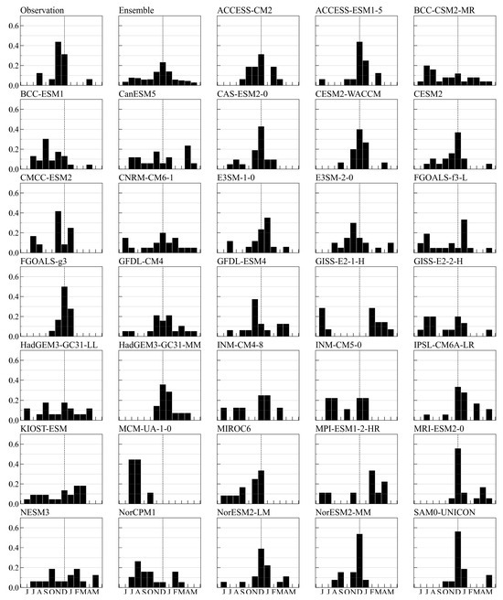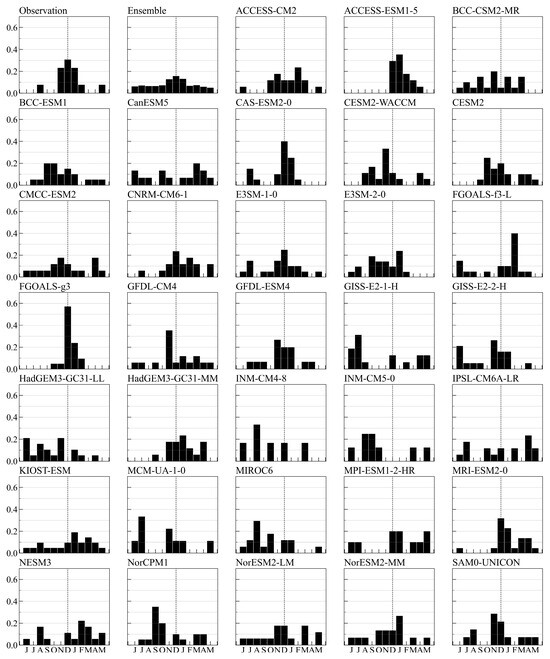 Similar to the peak month distribution of El Niño events, the observed peak months of La Niña events show a single-peak distribution structure, with the peak month located in winter (November–January) (Figure 4). However, there is greater inter-model variability in the probability distribution of the peak month of La Niña events in the model, with an even smaller number of models having a single peak located in the winter season. Models with a single peak located in the winter season in the peak month distribution of La Niña are ACCESS-ESM1-5, CAS-ESSM2-0, CESM2-WACCM, CESM2, CNRM-CM6-1, ESM-1-0, ESM-2-0, FGOALS-g3, GFDL-CM4, GFDL-ESM4, HadGEM3-GC31-MM, MRI-ESM2-0, NorESM2-MM, SAM0-UNICON, and TaiESM1.