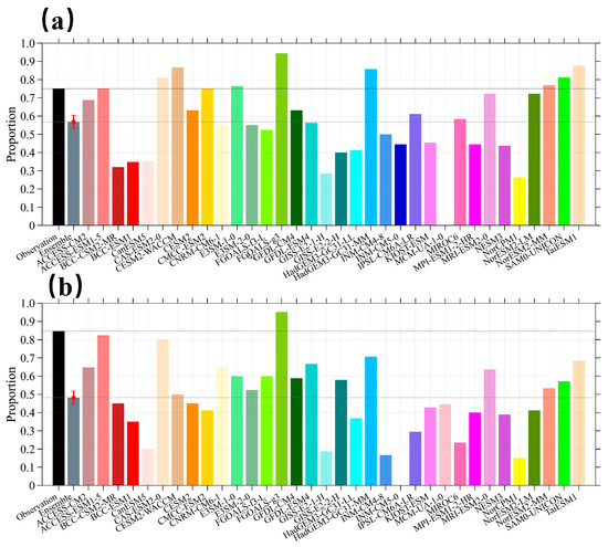 In addition to the previously mentioned biases in the El Niño and La Niña peak month simulations, there are still large biases in the probability distributions of the peak months of independent El Niño events in the models (Figure 3 and Figure 4). The probability distributions describe this model’s inadequate simulation of ENSO seasonal phase-locking, and it is important to fully explore this inter-model difference in the simulation of the peak month of independent El Niño events. They may provide useful information for the causes of the inadequacies of ENSO phase-locked characteristics in our best climate models. Here, we further quantify the inter-model differences by comparing the number of winter-peaking El Niño events and winter-peaking La Niña events, relative to their respective total number of events in the models. ENSO events tend to peak during the boreal winter months of November to January (NDJ) of the next year in observations. We define the winter-peaking El Niño (La Niña) events as El Niño (La Niña) events that reached their maximum during the November to January (NDJ). Figure 5a shows the proportion of winter-peaking El Niño events to all El Niño events in the observations and CMIP6 model, and Figure 5b also shows the proportion of winter-peaking La Niña events to all La Niña events, which is an important measure of the seasonal phase-locking strength of El Niño and La Niña events simulated by the models.