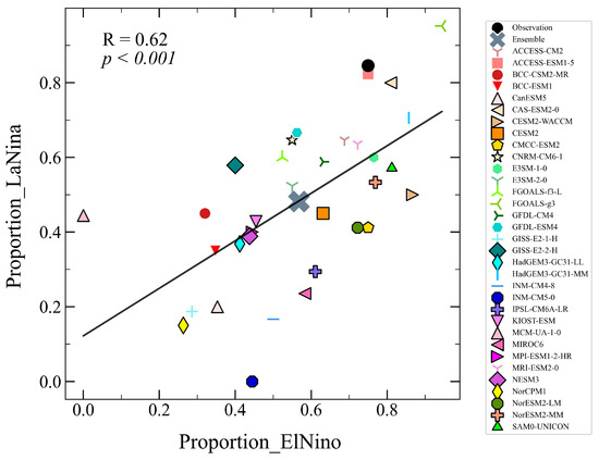 We have also found that models that perform poorly in modeling the proportion of winter-peaking El Niño events tend to perform poorly in modeling the proportion of winter-peaking La Niña events. Figure 6 presents a scatter plot of the correlation between the proportion of winter-peaking El Niño events and the proportion of winter-peaking La Niña events among the observations and models. The results show that there is a moderate positive correlation between the proportion of winter-peaking El Niño events and the proportion of winter-peaking La Niña events. The correlation coefficient (0.62) passes the significance test of 99.9%.