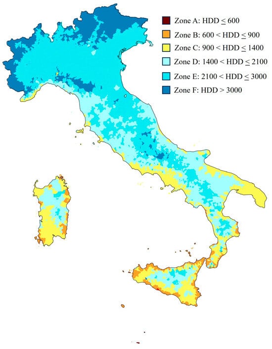 This study was conducted on all the national territory of Italy. The Italian territory is classified into 6 climatic zones (Figure 1) on the basis of the Heating Degree Days index (HDD) [], defined as the accumulation of all the positive differences between the daily mean outside temperature (Te) and an internal set point temperature equal to 20 °C during the whole heating period. The formula is: