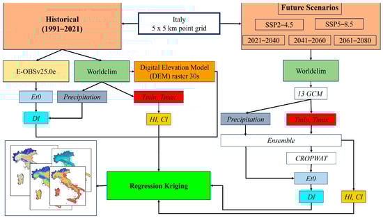 Regression-kriging (RK) [] was performed for spatial interpolation of the bioclimatic indices. This interpolation is a non-static geostatistical method which utilizes linear or multiple regression analysis of auxiliary information spatially correlated, in this case the elevation of each point, to reduce interpolation errors in the case of spatialization of the bioclimatic indices. The elevation was considered by means of a Digital Elevation Model (DEM) raster, downloaded from https://www.worldclim.org at a resolution of 30 s. Leave-one-out cross validation (LOOCV) [] (Stone 1974) was performed for each grid point for the validation of the predicted bioclimatic indices in both the historical and future scenarios. The reliability/accuracy of the kriging model was verified with the normalized root-mean-square error (NRMSE) between the calculated and interpolated bioclimatic indices and with the R2 of the model (Table S1). The interpolation procedure by means of kriging and the cartographic rendering were conducted with SAGA GIS software (System for Automated Geoscientific Analyses) version 2.3.2 and QGIS version 3.16.11, respectively. A flowchart of the analytical process is reported in Figure 2.