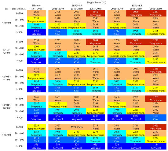 Huglin index classification of Italy during the historical period 1991–2021 and future scenarios SSP2-4.5 and SSP5-8.5 in 2021–2040, 2041–2060, and 2061–2080 by latitude and elevation.