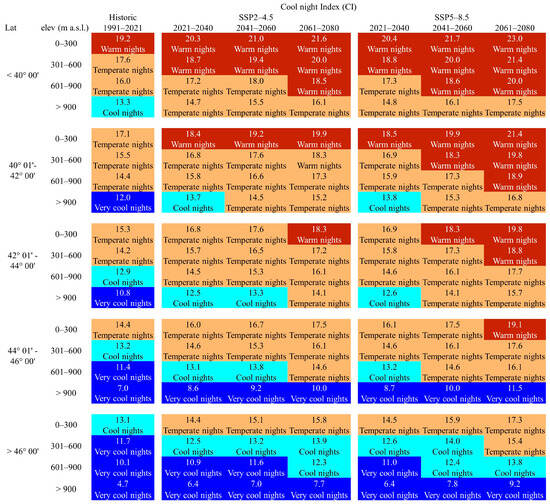Cool night index classification of Italy during the historical period 1991–2021 and future scenarios SSP2-4.5 and SSP5-8.5 in 2021–2040, 2041–2060, and 2061–2080 by latitude and elevation.