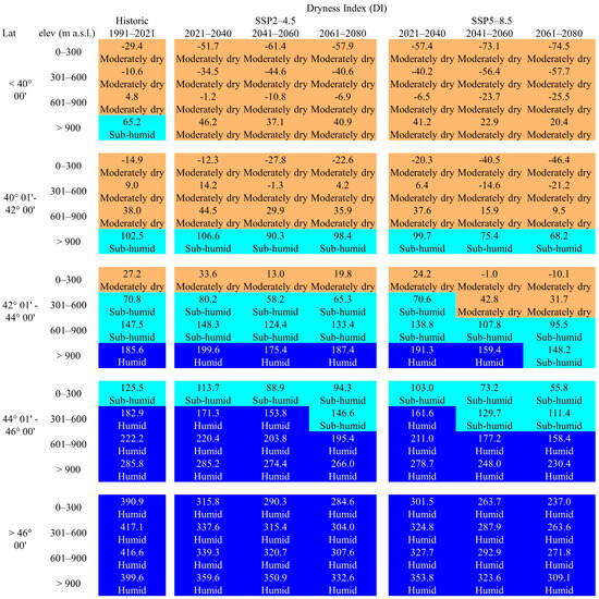 A decrease in precipitation in the future seems to have less impact on the classification of areas for the DI, mainly because the width of the DI classes is quite large, such as the “moderately dry” class, which ranges from −100 mm to 50 mm. On the other hand, both the analysis of the historical trends of the DI (Table 2) and the future projections (Figure 5) show conditions that appear to be consistent over time for latitudes above 44° N and from 300 m above sea level.