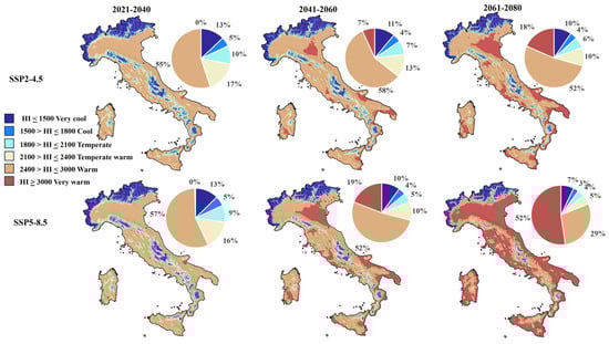 Spatial distributions of Huglin index (HI) in Italy in future scenarios SSP2-4.5 and SSP5-8.5 in 2021–2040, 2041–2060, and 2061–2080 and percentage classifications.