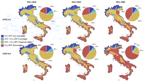 Spatial distributions of cool night index (CI) in Italy in future scenarios SSP2-4.5 and SSP5-8.5 in 2021–2040, 2041–2060, and 2061–2080 and percentage classifications.