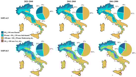 Spatial distributions of dryness index (CI) in Italy in future scenarios SSP2-4.5 and SSP5-8.5 in 2021–2040, 2041–2060, and 2061–2080 and percentage classifications.