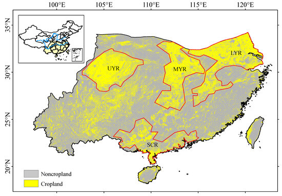 In this study, Southern China refers to the southern part of the eastern monsoon zone of China (Figure 1). This region has a complex human and geographical environment, covering about 25% of China’s land area and 60% of China’s population [53]. The region is dominated by subtropical and tropical monsoon climate types, with winter average temperatures exceeding 0 °C and annual precipitation above 800 mm. We applied high-quality land cover data produced by Yang and Huang [54], which encompassed Landsat and Moderate-resolution Imaging Spectroradiometer (MODIS) data, along with the random forest algorithm. We used annual land cover with a resolution of 30 m from 2001 to 2020 (https://zenodo.org/records/4417810, accessed on 5 July 2024), including nine types: forest, grassland, shrub, cropland, water, snow/ice, barren, impervious, and wetland. A cropland type was defined as cropland on the same grid that did not change in at least 11 years during 2001–2020 (Figure 1). In this way, we roughly divided southern China into four major agricultural regions based on a grid of highly agglomerated cropland: the upper Yangtze River region (UYR) (i.e., the Sichuan Basin), the middle Yangtze River region (MYR) (mainly including Hubei and Hunan provinces), the lower Yangtze River region (LYR) (mainly including Jiangsu, Anhui, and Jiangxi provinces), and the South China region (SCR) (mainly including Guangdong and Guangxi provinces). These four major agricultural zones mainly produce rice and wheat.