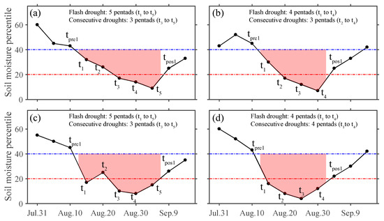 Illustration the definitions of flash drought with minimum durations based on SM percentiles. (a–d) denote Case 1, Case 2, Case 3, and Case4, respectively.