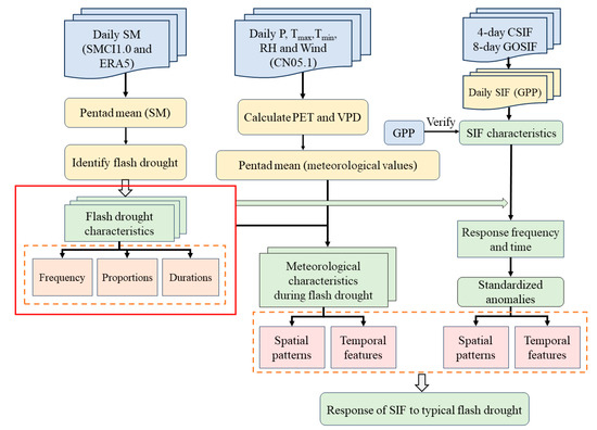 As shown in Figure 3, we first calculated the pentad mean SM, meteorological variables, and SIFs based on daily values. The identification of flash droughts with specific four cases was performed based on the pentad mean SM. We then explored the frequency and duration characteristics of flash droughts in the agricultural areas of southern China. Next, we investigated the meteorological characteristics under flash drought conditions, and then analyzed the response characteristics of SIF to flash droughts. Finally, we explored the response characteristics of vegetation photosynthesis capacity to flash droughts by analysis of a typical event in 2019.