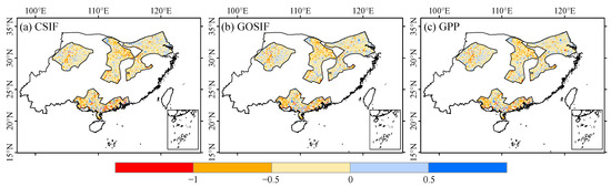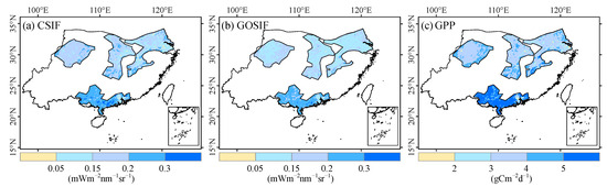 Spatial patterns of annual averages of (a) CSIF, (b) GOSIF, and (c) GPP for the period of 2001–2020.