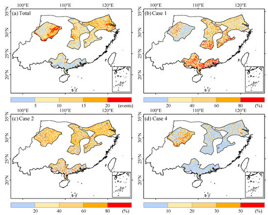 Spatial patterns of (a) total flash drought frequency and proportions of (b) Case 1, (c) Case 2, and (d) Case 4 events relative to the total events during 2001–2020.