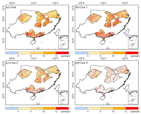 The average durations of flash drought events were determined by dividing the total durations by the total frequency count. As shown in Figure 6a, the mean durations of total flash drought events were mainly concentrated in 6–12 pentads, and their spatial characteristics were almost inversely distributed with the total frequency characteristics. The mean durations of the Case 1 events were more than 10 pentads in most regions (Figure 6b). The spatial durations of Case 2 events were similar to those of the total events, but the specific values were relatively small (Figure 6c). There were almost no Case 4 events in most of the SCR and in the southern parts of the MYR and LYR, so we used white to indicate the Case 4 durations in these regions (Figure 6d). It is interesting to note that for Case 4 events in most of the UYR, as well as in the central and northern areas of MYR and LYR, their mean durations were concentrated in <6 and >12 pentads, suggesting that these events with the highest rapidity of drought have either very short or very long mean durations.