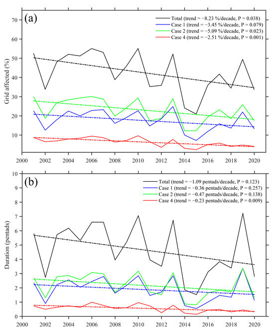 We next investigated the area proportions of flash drought per year. The area proportion was defined as the number of grids with at least one flash drought event per year divided by the total count of grids across the study area. As depicted in Figure 7a, the proportion of flash drought-affected areas in the main agricultural areas in the southern parts of China showed a significant decreasing trend (−8.23%/decade), consistent with decreasing trends of Case 1, Case 2, and Case 3 events. Relatively large proportions of area with total flash droughts were recorded in 2001, 2004, 2005, 2006, 2007, 2010, 2013, and 2019, accounting for about half of the total grids. The area proportion changes of Case 1, Case 2, and Case 3 events mirrored those of the total events, yet the specific proportion values were notably lower, especially for the Case 4 events. To further verify the reliability of the SMCI 1.0 in identifying the proportion of area with flash droughts, we compared the area proportions of flash droughts using 0–30 cm SM of SMCI 1.0 and 0–28 cm SM of ERA5. Although the area proportions of flash droughts based on ERA5 data were generally higher than those based on SMCI 1.0 (Figure S3), both data show decreasing trends in the area proportions of flash droughts from 2001 to 2020, with consistent changes. Overall, our analysis indicated that the SMC 1.0 has high reliability in recognizing flash droughts. For the extended study period of 1981–2020 (Figure S4), the area proportion of flash droughts based on ERA5 0–28 cm showed a significant upward trend (6.11%/decade), especially for Case 4 events. This suggests high long-term risks of flash droughts in the main agricultural areas of southern China, especially for the most rapidly occurring type of events (i.e., Case 4). The durations of flash droughts (trend = −1.09 pentads/decade, P = 0.123) had a slightly more decreasing trend than the proportion of area during 2001–2020 (Figure 7b). The top three years in the last two decades with long flash drought durations were 2019 (7.22 pentads), 2010 (7.06 pentads), and 2013 (6.74 pentads), indicating severe flash droughts in these years.