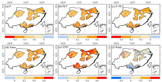Spatial patterns of standardized anomalies of (a) precipitation, (b) PET, (c) P–PET, (d) Tmax, (e) VPD, and (f) wind speed under flash droughts during 2001–2020.