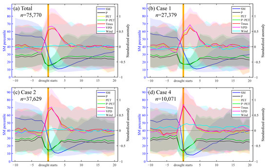 To gain a clear understanding of the mechanisms behind flash droughts, we examined the temporal evolutions of meteorological variables associated with drought conditions. During flash droughts, we observed a below-normal water quantity, indicated by P and P–PET, as well as an above-normal evapotranspiration capacity, reflected in Tmax, PET, and VPD (Figure 9a). There was little obvious change in wind speed during the evolution of flash drought, suggesting less effect of wind speed on flash drought in the study area. Precipitation and P–PET generally dropped rapidly to their maximum negative values about two pentads earlier than SM. The evolutionary characteristics of meteorological variables for the Case 1 (Figure 9b), Case 2 (Figure 9c), and Case 4 (Figure 9d) events were similar to those of the total events, but the rapid phase of flash drought and total drought duration slightly differed for the different cases. Evapotranspiration capacity variables (Tmax, PET, and VPD) of Case 4 events during the drought rapid phase increased more rapidly than those of Case 1 and Case 2 events. Compared to Case 1 and Case 2 events, Case 4 events exhibited a slightly faster decrease in water volume (P, P–PET, and SM), with a more pronounced negative peak.