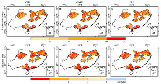 (a–c) Response frequency and (d–f) response time of CSIF, GOSIF, and GPP to flash droughts in the main agricultural areas of southern China during 2001–2020.