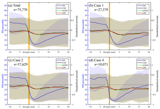 Temporal evolution of CSIF, GOSIF, and GPP during flash droughts for (a) total, (b) Case 1, (c) Case 2, and (d) Case 4 events in the study area during 2001–2020. In each subplot, the left y-axis represents the SM percentile, whereas the right y-axis denotes the standardized anomalies of the vegetation indices. Lines indicate the median values, and shading denotes the interquartile range. Additionally, the total number of flash drought events at the grid scale is labeled as “n”.