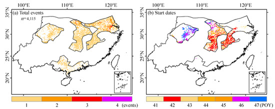 Spatial distributions of (a) the flash drought frequency in 2019 and (b) the start dates of flash droughts during 41st–47th pentads (20 July–23 August) of 2019. POY: pentad of year. The total number of flash drought events at the grid scale is labeled as “n”.