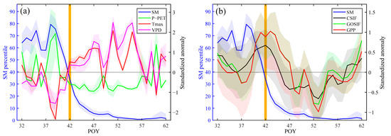 Temporal features of (a) meteorological and (b) vegetation indices during 2019 flash droughts in the study area. In each subplot, the left y-axis denotes the SM percentile, whereas the right y-axis denotes the standardized anomalies of the meteorological or vegetation indices. Lines indicate medians and shading indicates the interquartile range. A total of 727 grids had a flash drought start in the 42nd pentad of 2019. POY: pentad of year.