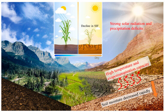 Overall, SIF exhibits promising advantages in terms of vegetation response to flash droughts. The cumulative and lagged effects on ecosystems as flash droughts evolve into prolonged droughts need to be explored in depth in the next study. The results of this study may provide great potential for leveraging SIF as a tool to monitor ecosystem resistance against flash droughts, thereby enhancing the ability to assess the potential impacts of droughts on ecosystems and develop appropriate countermeasures for different vegetation types under different climatic characteristics. In agricultural regions with hotspots of flash droughts, there should be a prioritizing of crop varieties that exhibit robust resistance to flash droughts to optimize the regional cropping structure, thereby enabling resilience against the adverse effects of drought. Furthermore, enhancing water utilization efficiency within agricultural areas and implementing water-conserving irrigation practices are strategic measures aimed at mitigating the detrimental impacts of flash droughts on crop health and productivity.