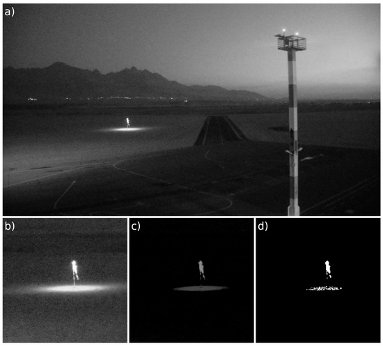 (a) An original camera image, taken at the Poprad–Tatry Airport (30 August 2019, 3:00 a.m.) in the northern direction. (b) An example of a key point neighborhood around the illuminated wind bag, as identified in (a). (c) Key point neighborhood as a result of the modification of (b) by morphological erosion. (d) Key point neighborhood in the form of a binary image.