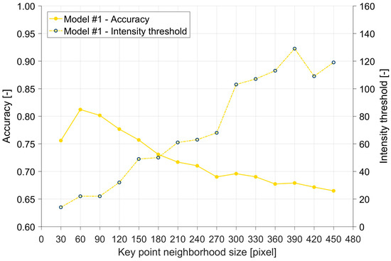 To evaluate the effect of the default settings of the patch size on the final outcomes of the analysis, an experiment using 15 different neighborhood sizes was also conducted. Herein, various neighborhood sizes were defined, ranging from 30 to 450 pixels, with a step of 30 pixels (i.e., a square patch of the size of 30 × 30, 60 × 60, 90 × 90 pixels, etc.). In the end, for each of the ~7000 key points from the final data set, 16 different image patches were prepared, including the default size (256) and an additional 15 from the described experiment (from 30 to 450 pixels). The same procedure was applied both on the ‘original’ and the ‘modified’ images.