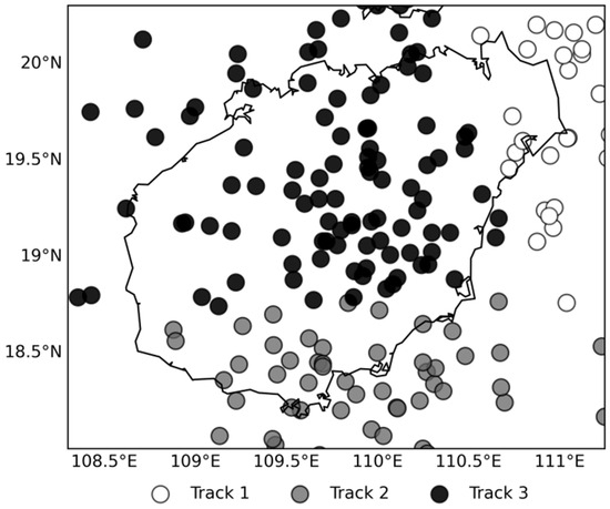 The cluster analysis yielded three typhoon track groups (Figure 3): Typhoons in the first group (Track 1) primarily originated from the southeast of Hainan Island, traversing the central region of the island from east to west, characterized by relatively high movement speeds and moderate intensities.