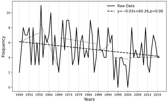 Number of typhoons affecting Hainan Island from 1950 to 2020. Notes: The dashed trend line is derived from Theil–Sen regression after three-point average smoothing. Dotted lines represent segmented regression after breakpoint detection, which is used to analyze the trend changes in different periods.