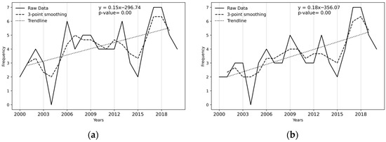 Figure 4 presents the number of typhoons affecting Hainan Island from 1949 to 2020. Over this period, typhoon frequency shows a statistically significant declining trend of 0.3 events decade−1 (p = 0.00) with notable inter-decadal variability. Specifically, the mid-1950s and mid-1960s experienced higher frequencies of typhoon events, averaging around 6 events year−1, with some years reaching up to ten events. The years from 1949 to 1959 were marked by a significant increase in typhoon activity, culminating in 1960 with 11 events, the highest annual count observed in the past seventy years. From 1960 to 1989, although the overall number of typhoons began to decline, the rate of decrease slowed, with most years recording fewer than four events per year. The period from the 1990s to the early 2010s witnessed larger fluctuations, with typhoon counts in some years approaching eight, indicating a pattern of initial increase followed by a decrease. Over the last two decades (2000–2020), typhoon events affecting Hainan have fluctuated between three to six events annually. This analysis aligns with Wu’s findings, indicating a significant reduction in typhoon frequency impacting Hainan Island from 1962 to 2005 [12].
